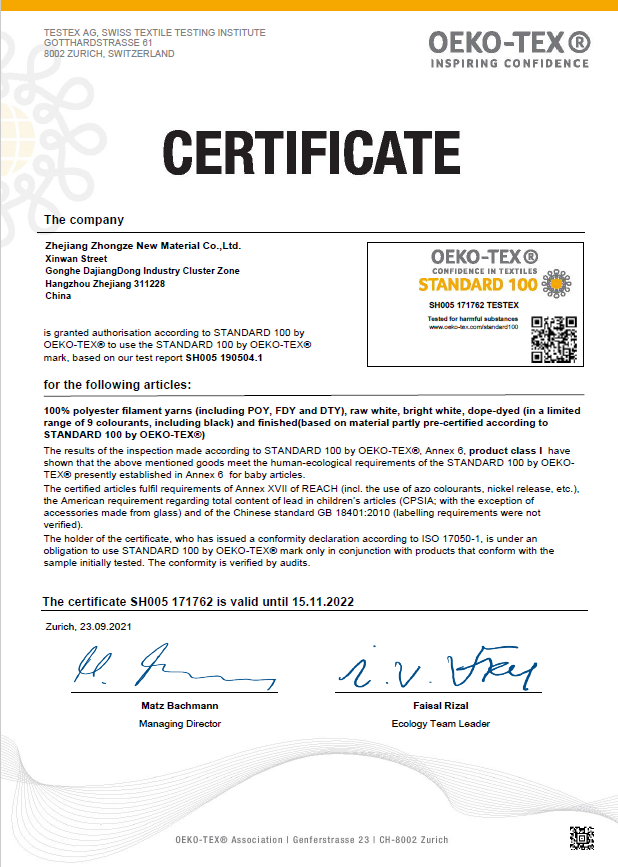 Oeko tex standard certificate is the most authoritative and influential textile ecological label in the world. The products with Oeko-tex standard 100 label have been tested and certified by well-known textile testing institutions in 15 countries around the world (all affiliated to the International Environmental Protection Textile Association). Oeko-tex standard 100 label products provide a guarantee for the ecological safety of products.